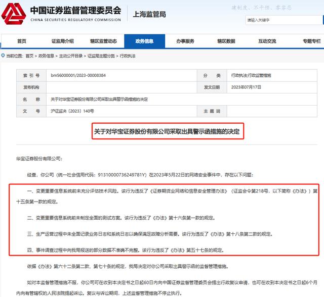 需要指出的是,华宝证券今年并非第一次被罚。早在7月份,华宝证券曾因网络安全事件相关问题而受到上海证监局的监管措施,当时该公司被出具了警示函。