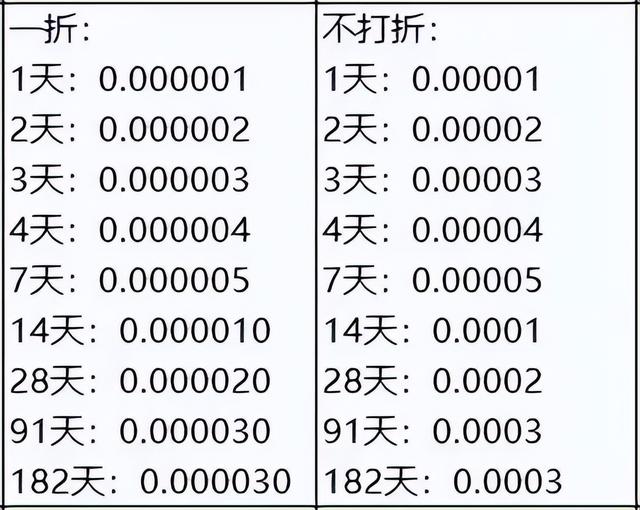 1天期利率为0.001%;2天期利率为0.002%;3天期利率为0.003%;4天期利率为0.004%;7天期利率为0.005%;14天期利率为0.01%;28天期利率为0.02%;91天期利率为0.03%;182天期利率为0.03%。