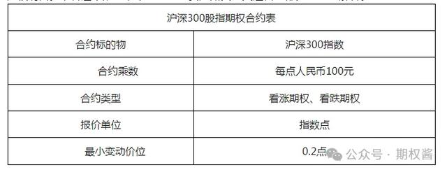 根据中金所沪深300股指期权合约表(部分)显示,沪深300股指期权合约乘数为每点100元,最小变动价位为0.2点。