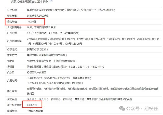 沪深300ETF期权与股指期权不同,它涉及现货交割。每份300ETF期权合约对应10000份300etf份额基金,而最小报价单位是0.0001元,即每点波动1元。