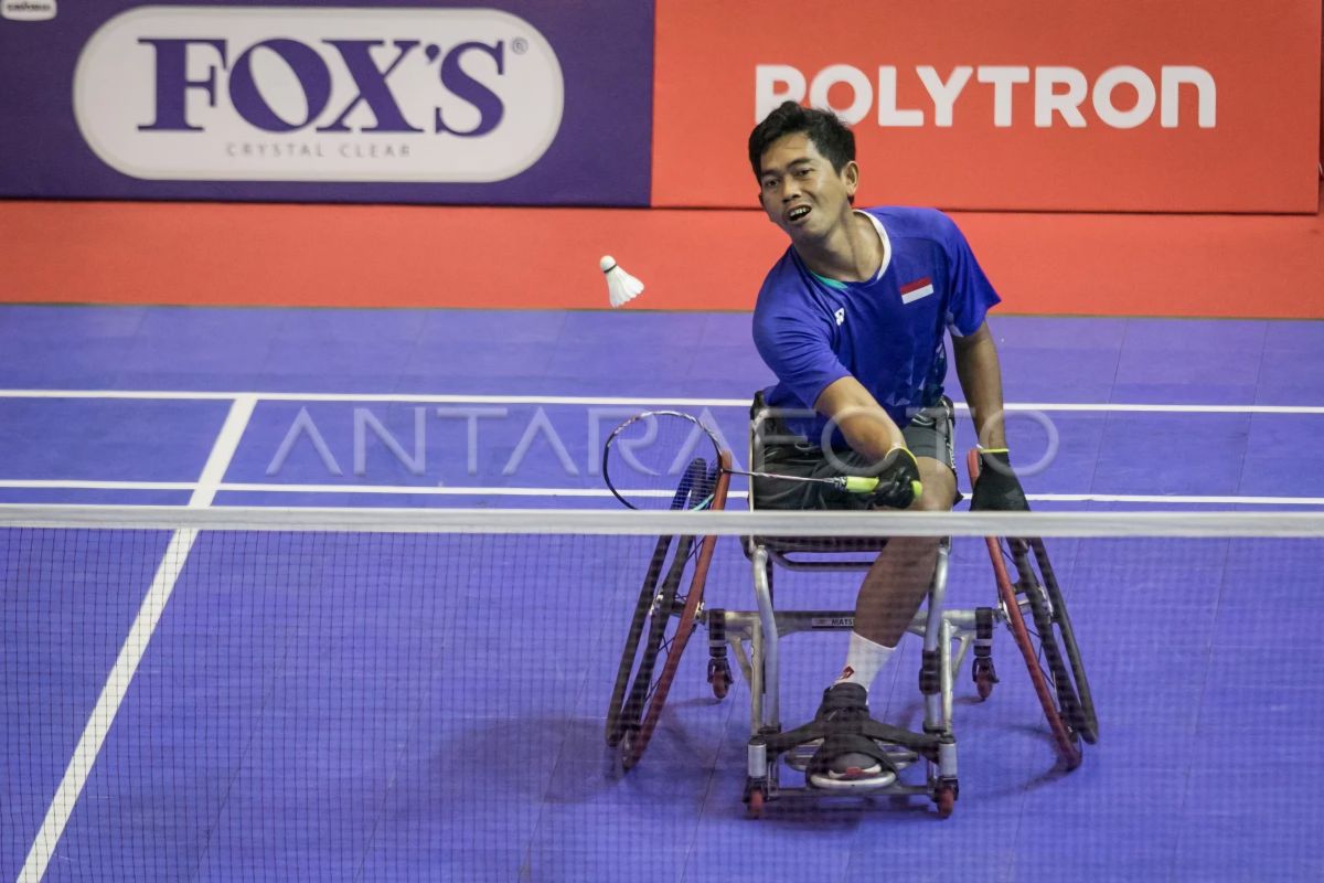2023年9月5日,在中爪哇梭罗举行的2023年福克斯印度尼西亚残疾人羽毛球国际赛上,印度尼西亚残疾人羽毛球运动员苏帕尔迪与印度选手穆纳·哈立德比赛。