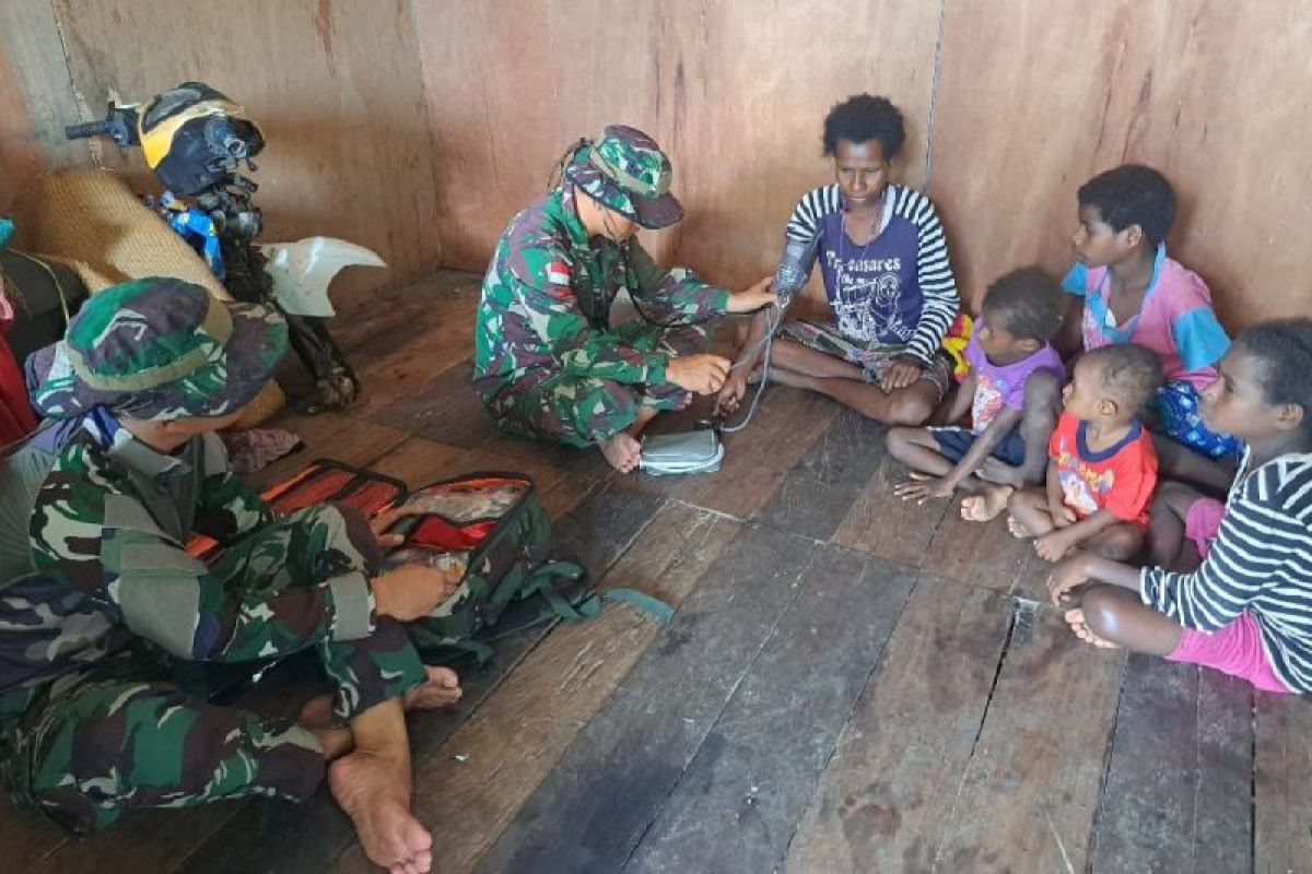 来自125/SMB步兵营工作队的印度尼西亚士兵为南巴布亚省Merauke区Kimaam分区Kiworo村的土著巴布亚人提供免费医疗服务。